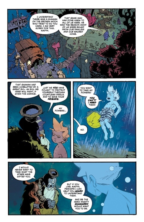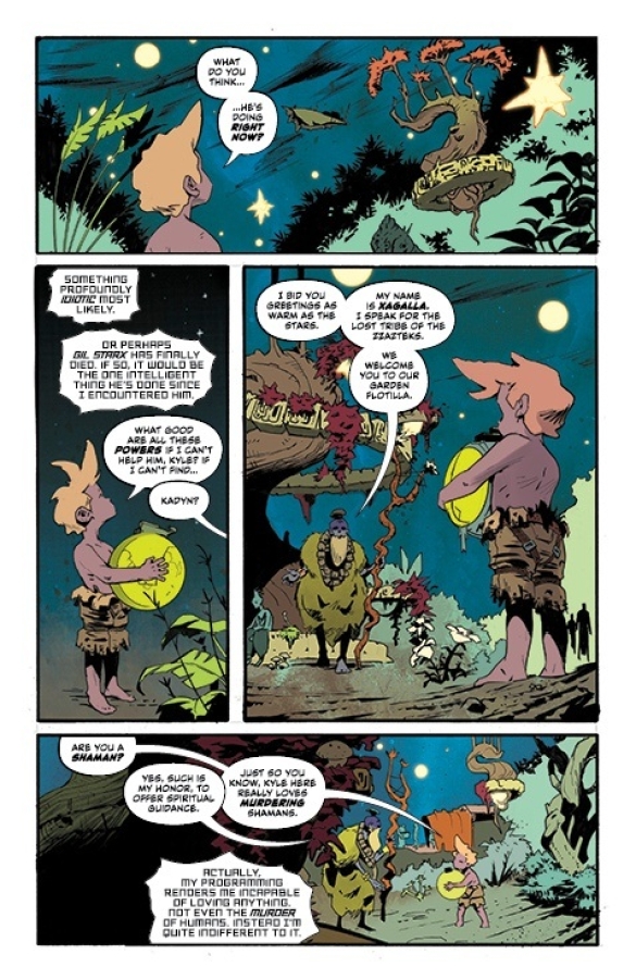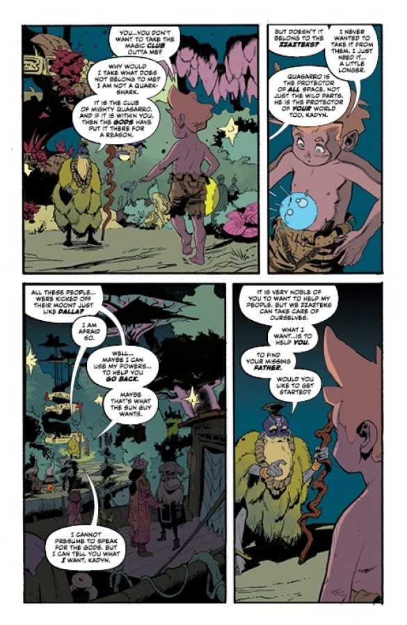 "THE PEOPLE OF THE BROKEN MOON," Part Four The Zzaztek natives of the wild heavens are searching desperately for their missing god. The space trucker Gil is searching for his son while clinging to his remaining sanity. And young Kadyn is searching for answers to his mysterious and increasingly self-destructive power in the darkest depths of space.