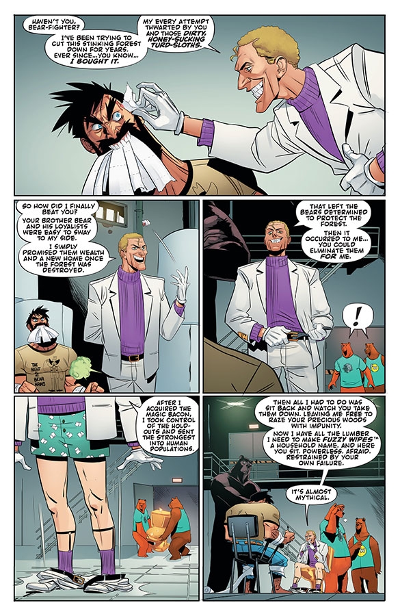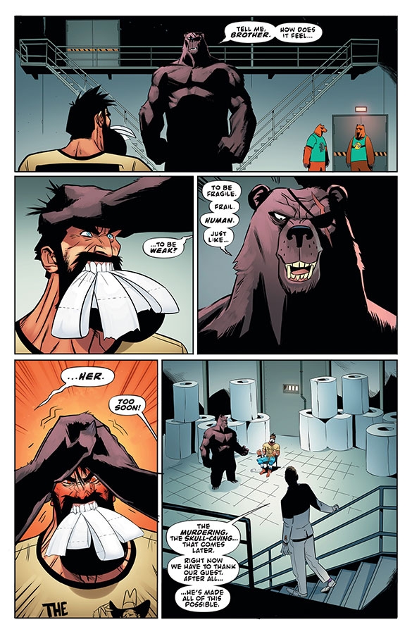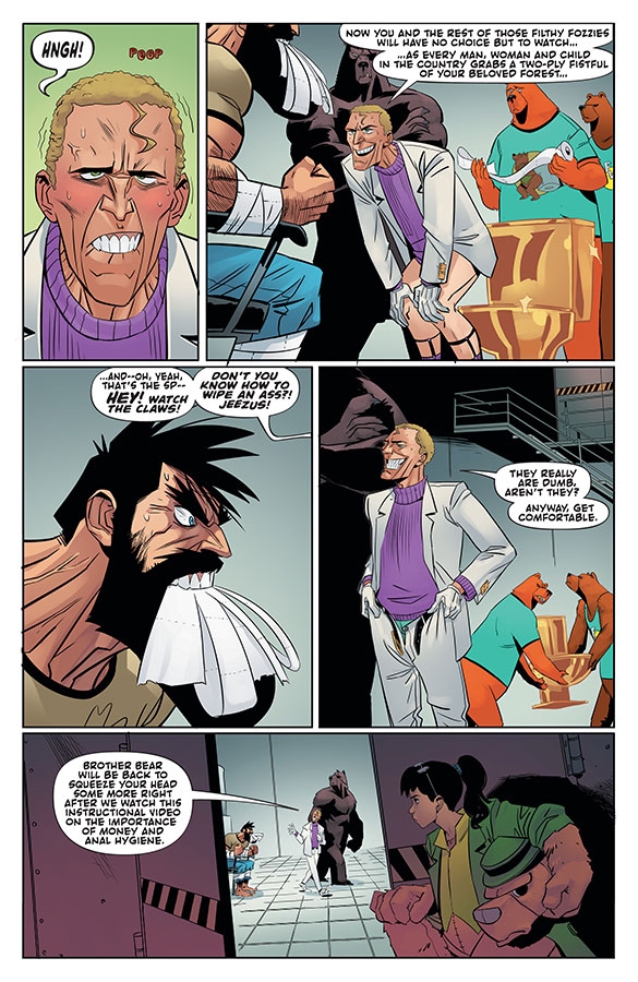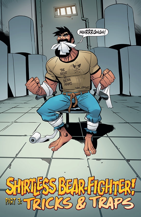 The mighty Shirtless is in the clutches of Fuzzy Wipes(TM) CEO Jaxson Logger, and it's up to rogue FBI agent Suzie Silva to bust him out! Don't miss bear-brawls, golden toilets, and…BETRAYAL in SHIRTLESS BEAR-FIGHTER #3!