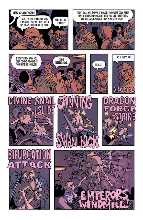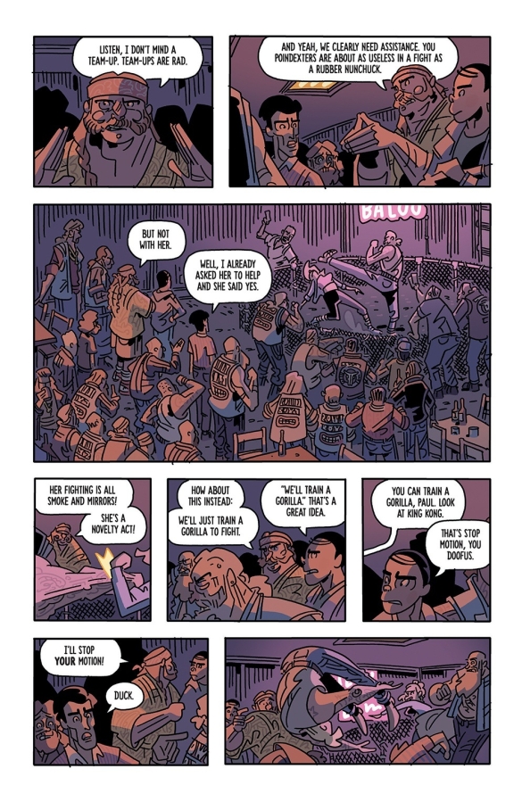 Looking to increase their muscle to protect their scrawny necks, our trio of former sidekicks heads to the world of underground fighting to recruit a former sidekick and martial arts prodigy. But then they all get drunk, and it’s a mess, folks. I think these folks might be dummies. But they’re PROBABLY getting closer to solving the mystery. The ACTION MYSTERY THRILLER continues from CHRIS SCHWEIZER and KYLE STARKS!