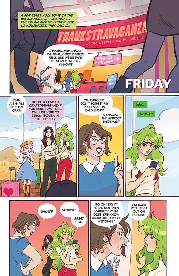 From bestselling BRYAN LEE O’MALLEY (Scott Pilgrim, Seconds) and superstar LESLIE HUNG, it’s SNOTGIRL! Lottie Person is a beloved blogger who just wants to live her life. Instead, she’s getting engulfed in a messed-up mystery while secretly suffering from alarming allergies. THIS MONTH: Sun and fun at a fashion-influencer fest in the desert. The first part of a two-part adventure! It’s "WEEKEND, PART ONE!" Don’t forget your allergy pills!