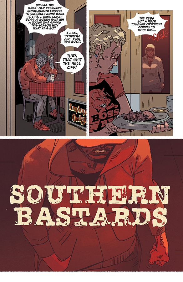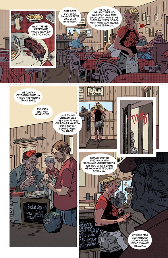 NEW STORY ARC: "GUT CHECK," Part One New story arc! Coach Boss holds sway over Craw County for one reason: he wins football games. But after the biggest, ugliest loss of his career, the coach must become more of a criminal than ever before, if he's gonna keep ahead of his enemies. Enemies like Roberta Tubb, who's come to town with a machine gun and some serious questions about how her daddy died. The 2015 Harvey Award-winning (Best New Series) and 2016 Eisner Award-winning (Best Continuing Series) southern-fried crime comic by JASON AARON & JASON LATOUR is back for another round of football, BBQ, and bloodshed!