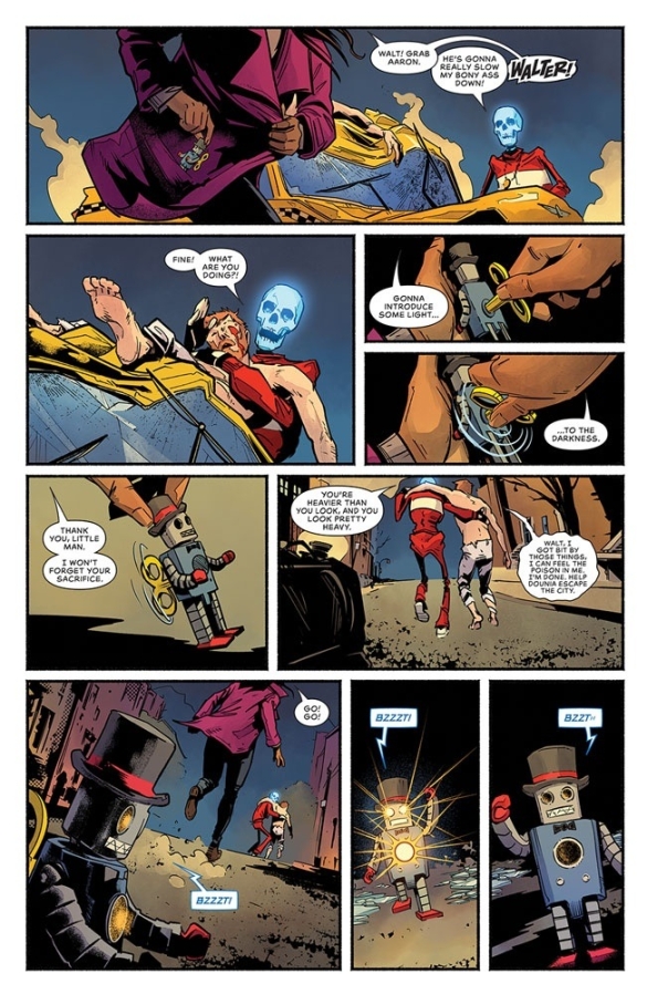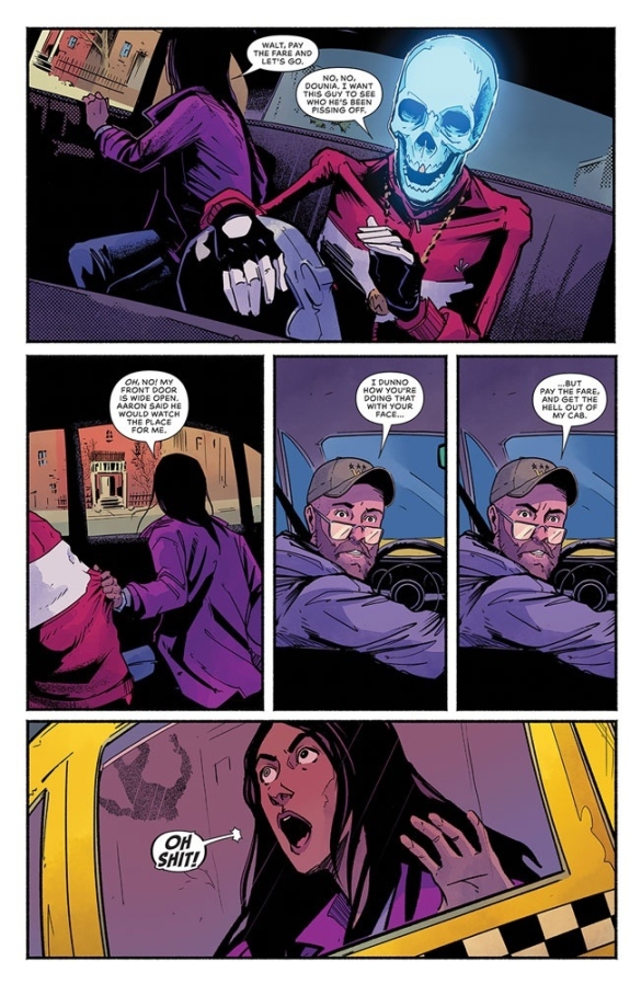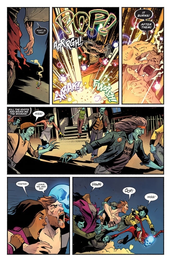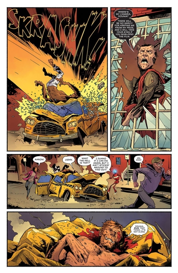 The hunt for a camera containing an undeveloped photo of the face of true evil threatens to wipe out New York City one chilly autumn evening. Doune Mahoney is the curator of a private collection of extremely dangerous cursed objects, and her night’s about to go to hell. Werewolves, secret societies, blessed animals, cursed objects, and more, in a fantasy horror comedy from X-Men and Deadpool writer GERRY DUGGAN, your new favorite artist SCOTT BUONCRISTIANO, and color artist extraordinaire TAMRA BONVILLAIN. Take a deep dive into THE DARK ROOM, a world the creators will be returning to for many years. Includes the first appearance of your new favorite characters, including Walt, the dancing bones of Times Square, and his blessed boom box.