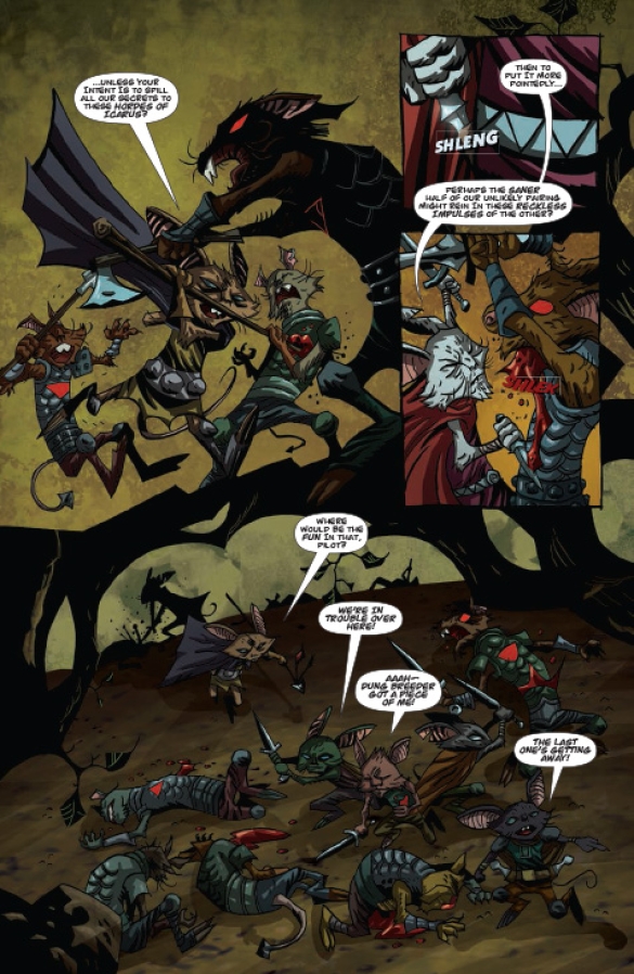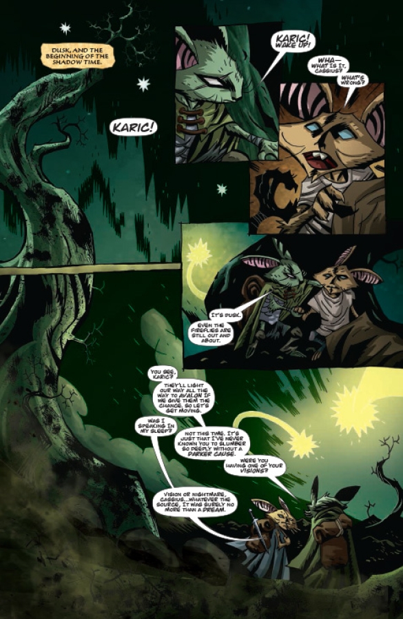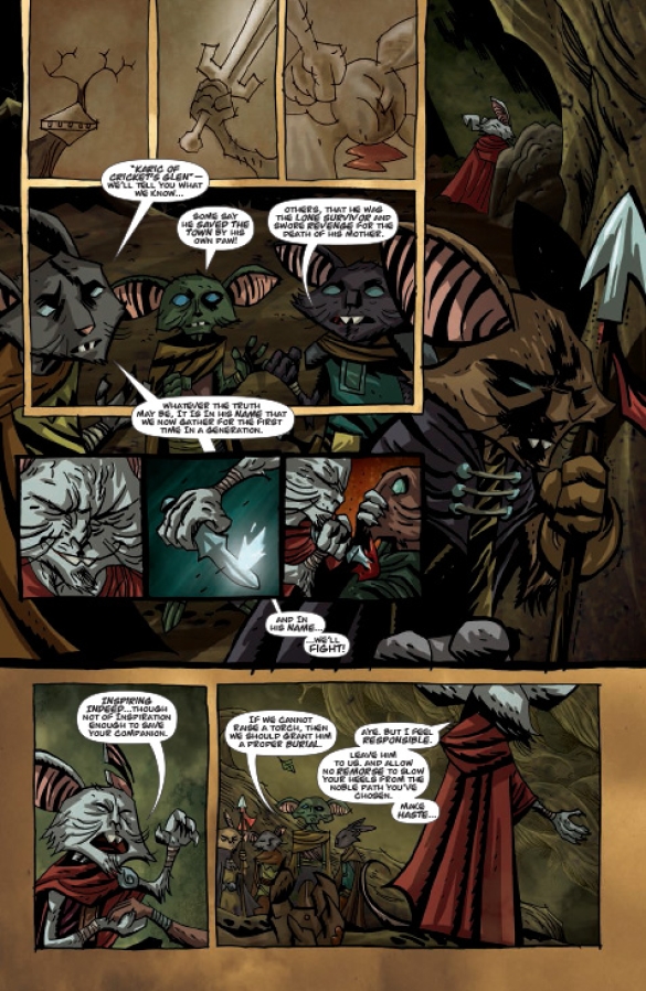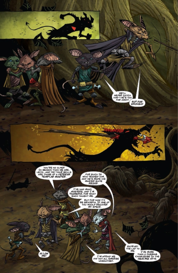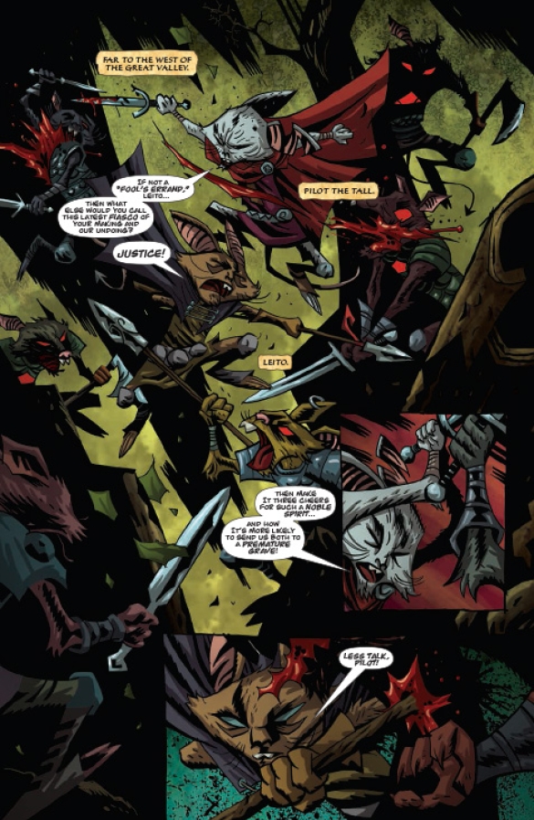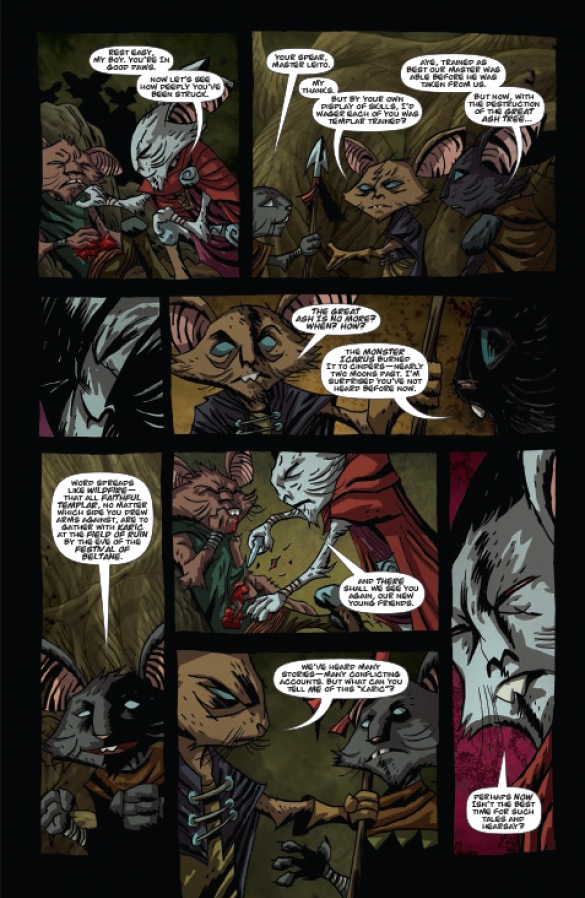 "LIKE A TORCH TO THE KINDLING" Pilot the Tall invokes Death Magic to discover the truth behind Karic’s destiny and what he discovers promises doom to all who follow the noble young mouse. Meanwhile, Karic and Cassius return to the Field of Ruin— Avalon, where the Templar fell—and must prove their loyalty to the assembled remnant, as well as their identity to ravenous cats seeking his legend.