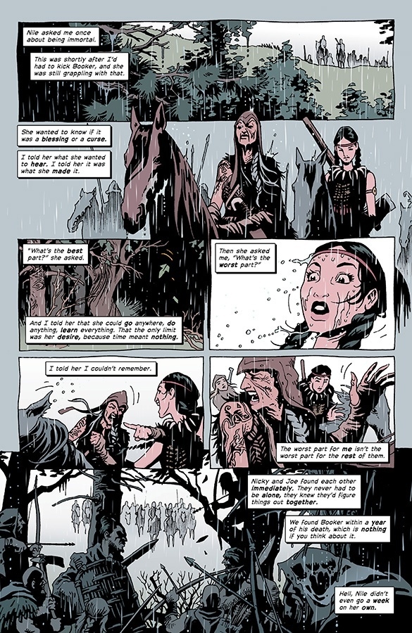 Nile grapples with her present, and with the potential of an eternal past. Andy welcomes a new-old enemy, and Nicky and Joe decide enough is e-goddamn-nough. Also: lots of bullets are used. Soon to be a major motion picture starring Charlize Theron and KiKi Layne, THE OLD GUARD roars back! From the acclaimed New York Times-bestselling team of GREG RUCKA and LEANDRO FERNÁNDEZ and the stellar artistic talents of DANIELA MIWA, JODI WYNNE, and ERIC TRAUTMANN.