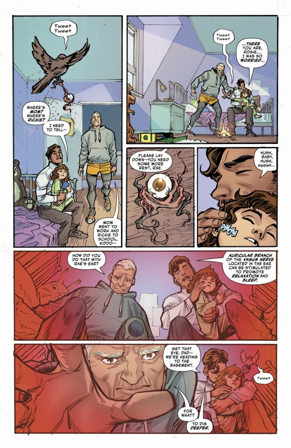 The mysterious floating eyeball attacks! The youngest Rocketfeller, Rae, has been infected by its gross, sticky tendrils, and it’s not looking good! And it’s not stopping with Rae, as it unleashes its coils throughout the entire house! Meanwhile, nosy neighbor Tony starts poking around the house at exactly the wrong time…