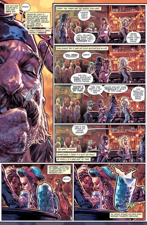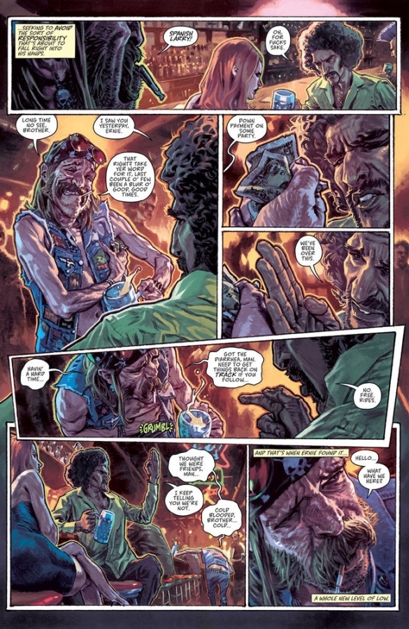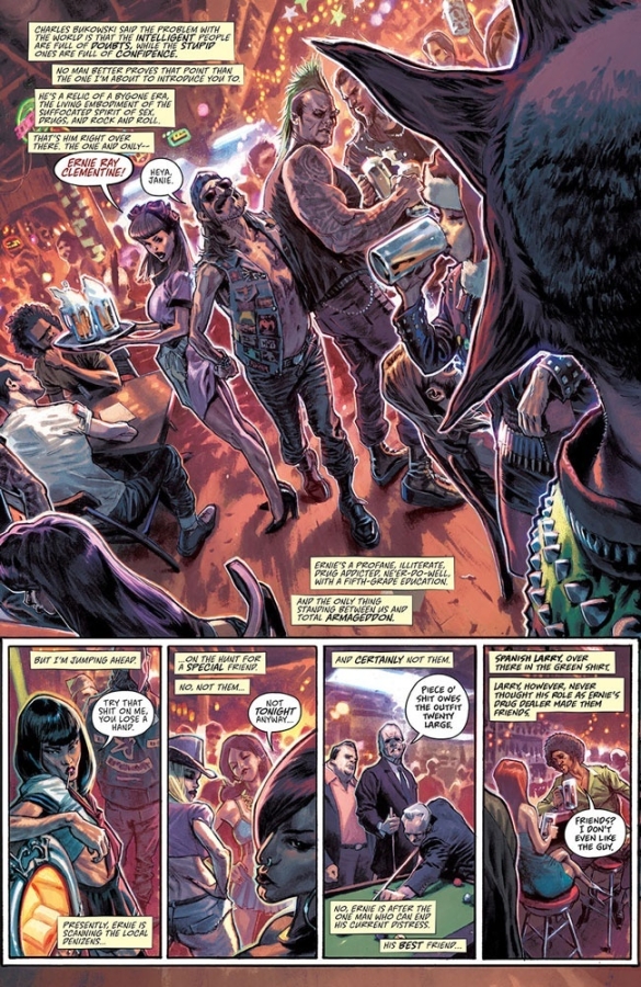 "JAZZ APPLE ARMAGEDDON," Part One The fate of the world rests in the hands of the worst person on it! NEW ONGOING SERIES from the writer of DEADLY CLASS! RICK REMENDER launches an all-new comedy espionage series, THE SCUMBAG—the story of Ernie Ray Clementine, a profane, illiterate, drug-addicted biker with a fifth-grade education. He’s the only thing standing between us and total Armageddon because this dummy accidentally received a power-imbuing serum, making him the world’s most powerful super spy. This new ongoing series will feature a murderers’ row of all-star artistic talent rotating each issue. The first issue showcases the stunning work of LEWIS LaROSA, with subsequent chapters and covers by brilliant talents such as ANDREW ROBINSON, ERIC POWELL, TULA LOTAY, WES CRAIG, ROLAND BOSCHI, SIMONE DI MEO, MARGUERITE SAUVAGE, DUNCAN FEGREDO, YANICK PAQUETTE, MIKE McKONE, DAVE JOHNSON, MORENO DINISIO, and many more!