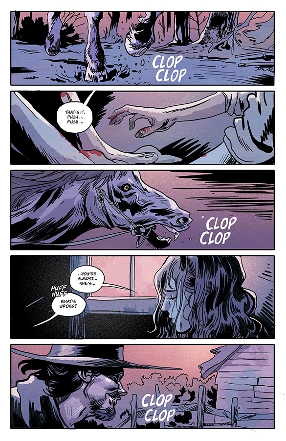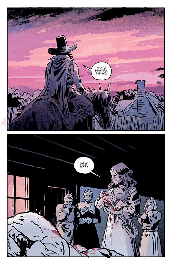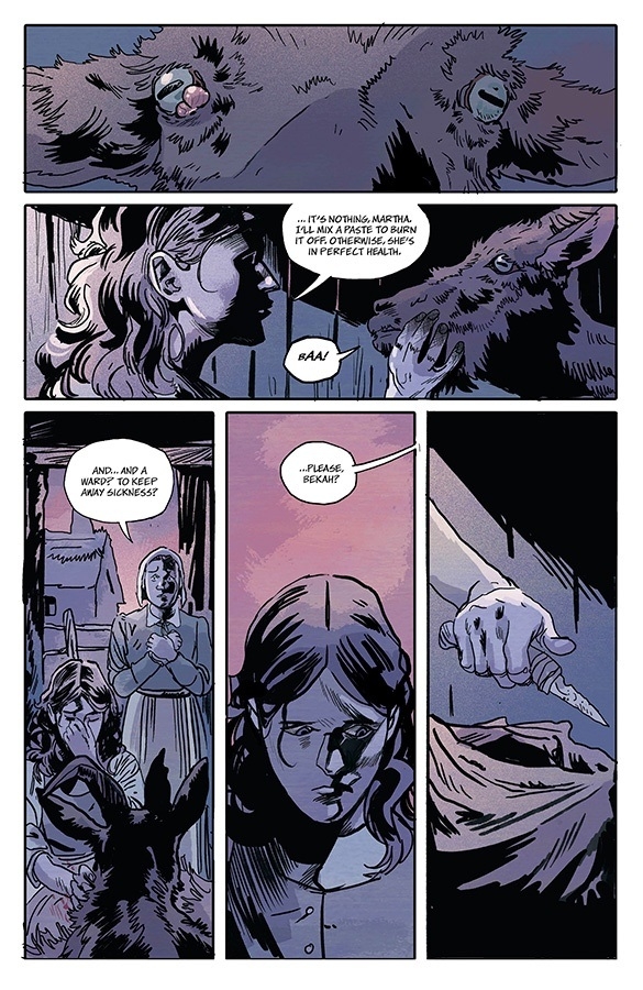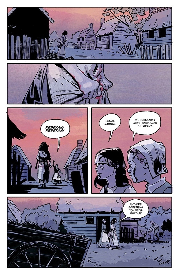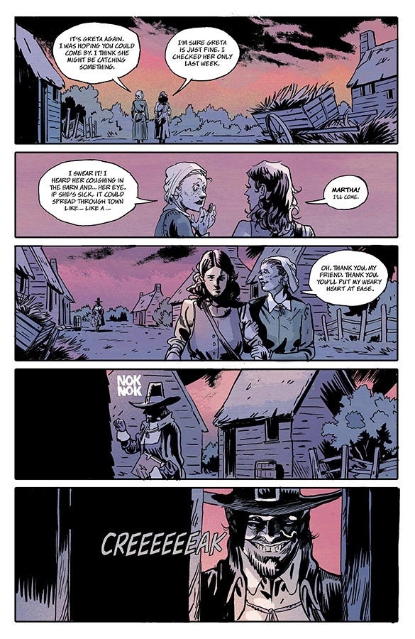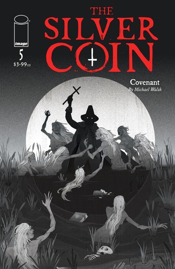 For the fifth installment of horror anthology THE SILVER COIN from MICHAEL WALSH, CHIP ZDARSKY, KELLY THOMPSON, ED BRISSON, and JEFF LEMIRE, the story reaches back to when the coin’s cruel curse was first minted. In a small New England village, a woman has been accused of witchcraft.