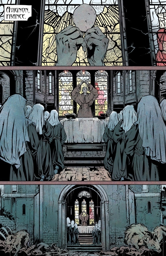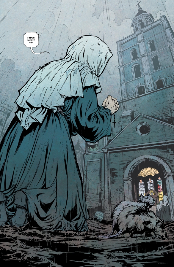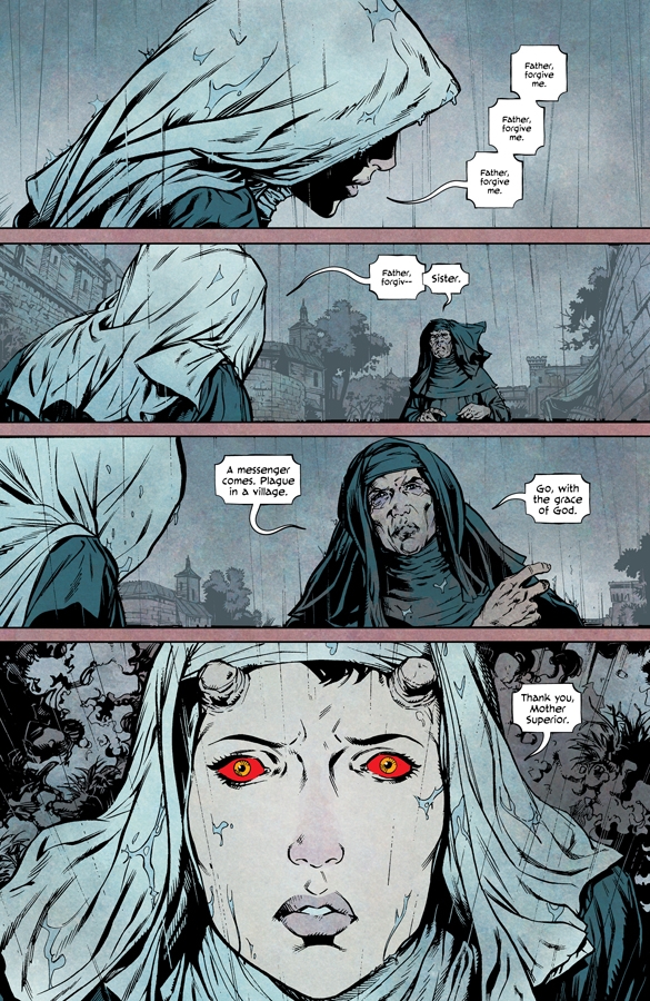 "THE TRANSUBSTANTIATION OF LUCIFER" The final THE WICKED + THE DIVINE historical special plunges into the shadow of life after the Black Death. KIERON GILLEN gets back together with THREE collaborator RYAN KELLY to tell the story of penitent nun Lucifer hearing the confession of penitent murderer Ananke. Yes, everyone will be sorry.
