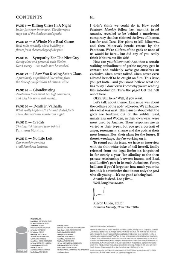 NEW STORY ARC: "IMPERIAL PHASE I," Part One Welcome to the November 2014 issue of Pantheon Monthly. Exclusive interviews with all your favorite gods. Plus! The first photographs of the Morrigan ever!