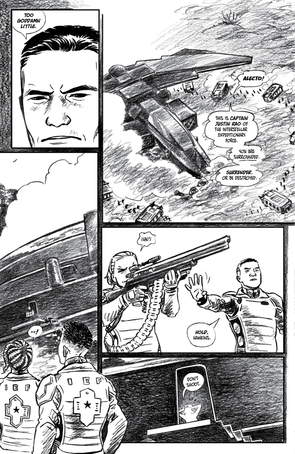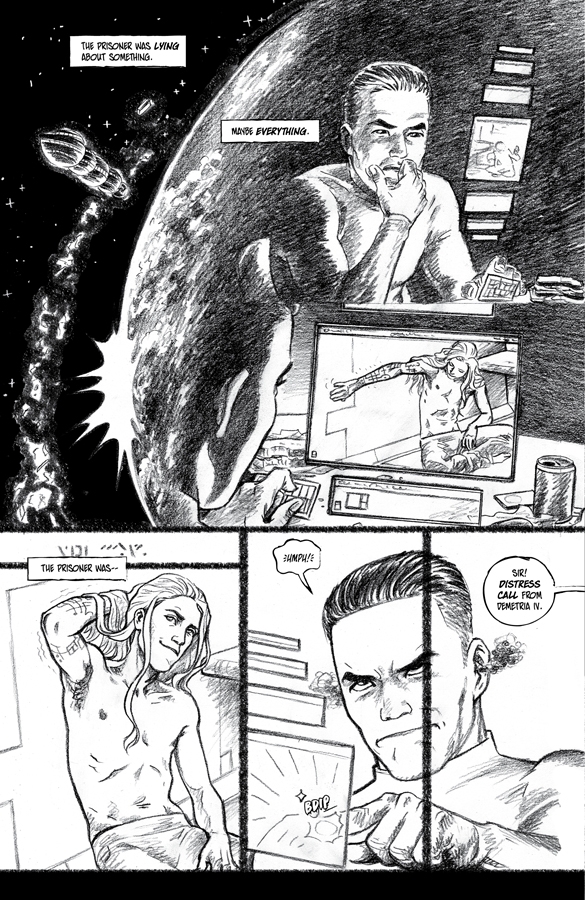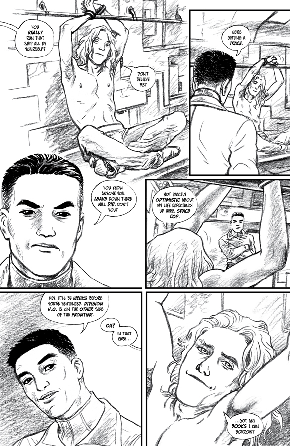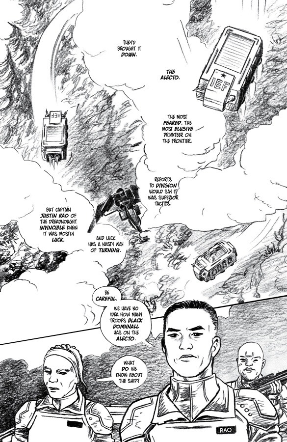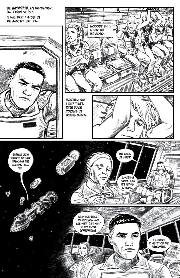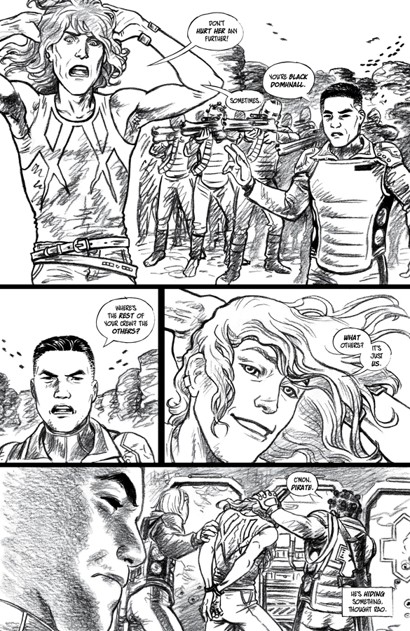 ISSUE THREE: "INVINCIBLE HEART" When Captain Rao of the intergalactic dreadnought Invincible captures the notorious privateer Black Domhnall, he thinks his problems are over. How wrong he is. The pirate is argumentative, infuriating, and way, way too pretty. But Captain Rao is a man of duty, and he will stick to his orders if it kills him. It just might. Drawn by CARLA SPEED McNEIL (NO MERCY, Finder). Backup comics story by MARGARET TRAUTH (Decrypting Rita, Silicon Dawn Tarot) and prose story by JESS BRADLEY.