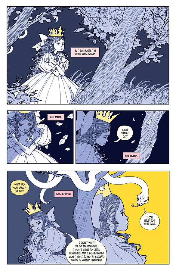 ISSUE FOUR: "TREASURED" When a princess who won't grow up runs away from her castle, she's befriended by a dragon who promises to keep her safe from the horrors of adulthood. But a cage is a cage, even when it's gilded. With her family alienated and no knights riding to the rescue, can she ever get herself free? Drawn by TRUNGLES (Fauns & Faeries, Mirror Mirror). Backup comics story by SARAH WINIFRED SEARLE (Sparks, Fresh Romance) and prose story by NAOMI SALMAN.