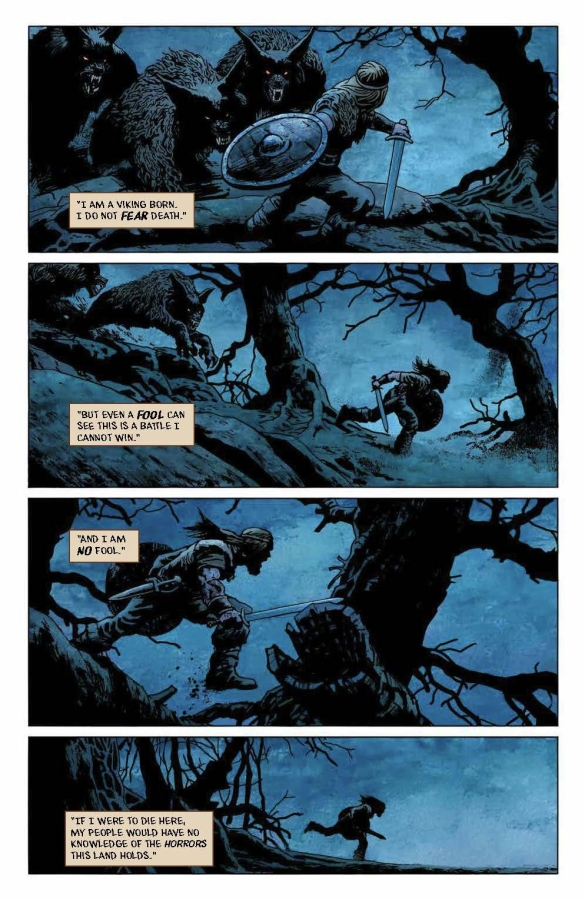 WEREWOLVES versus VIKINGS! Ulf and his tribe of Vikings sought a new life among the green, untamed land of the New World. Instead they have found horror and death! Barely surviving his first encounter with the native people and their supernatural protectors, Ulk seeks shelter for his people amongst the ruins of the Leif Erickson settlement from decades earlier. A tale of blood-curling horror and barbaric adventure from Eisner Award winner JOE PRUETT (VOICES IN MY HEAD, Cable, Domino) and legendary artist MARCELO FRUSIN (Hellbalzer, Loveless, KICK-ASS, THE NEW GIRL),
