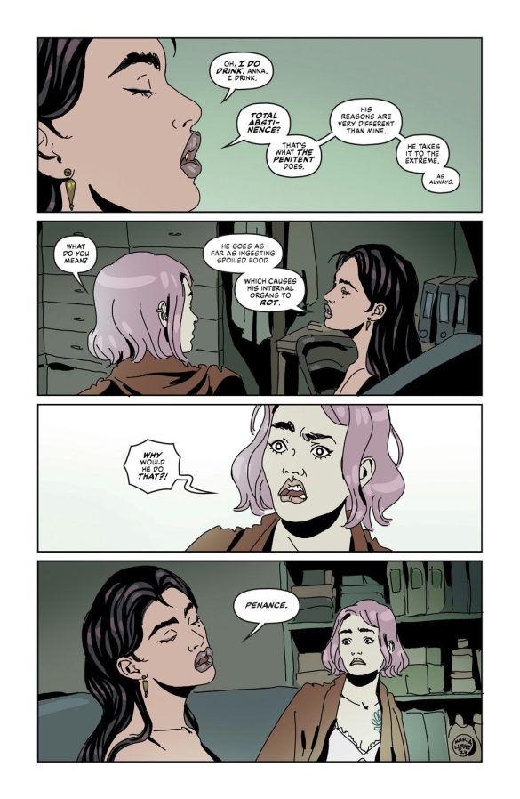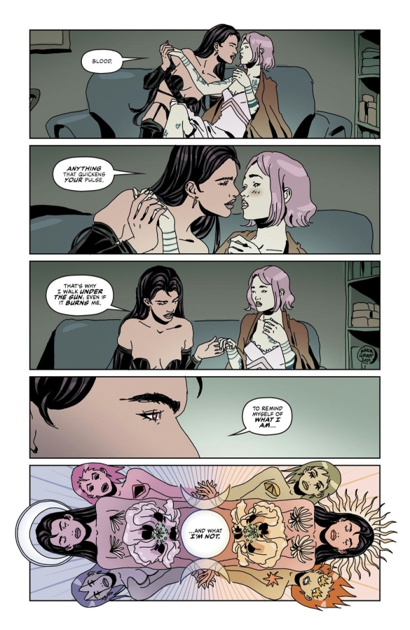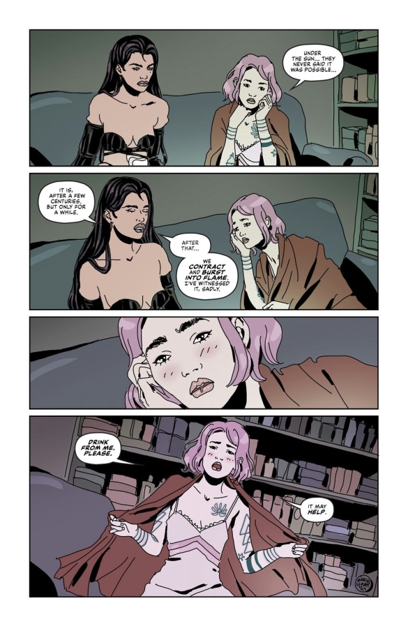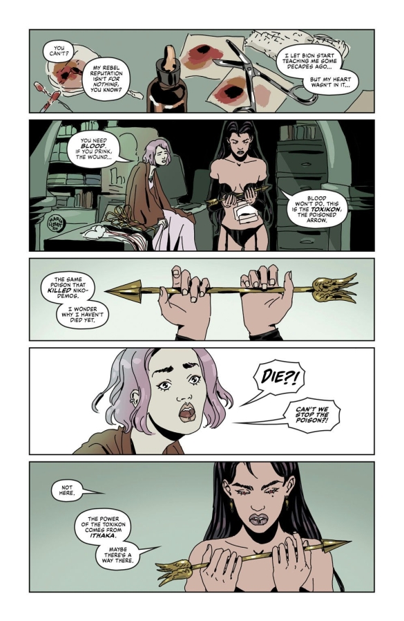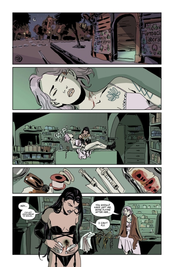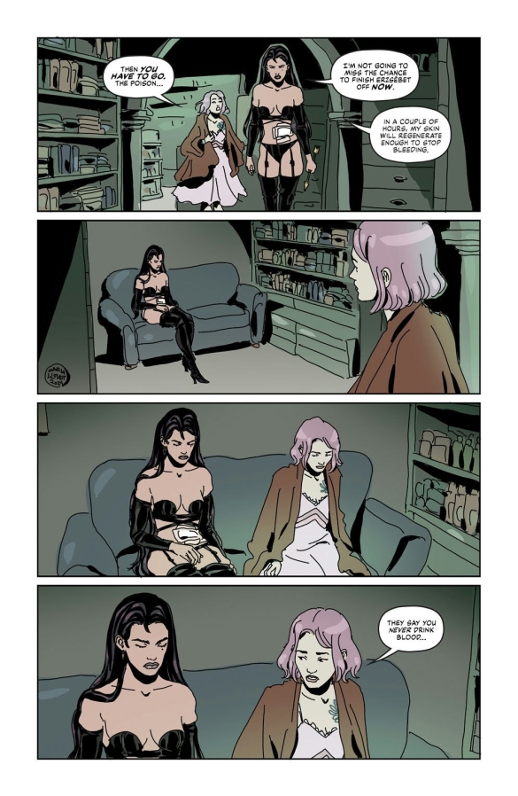 In issue #3…Erzsébet flees after hurting Carnelia with the TOXIKON, the poison arrow. Carnelia and Anna take refuge in a pharmacy where they tend their wounds. Carnelia explains her complicated relationship with Nikodemos and, as they bond, Anna offers her blood to Carnelia so she can heal. They end up sharing much more than just blood…