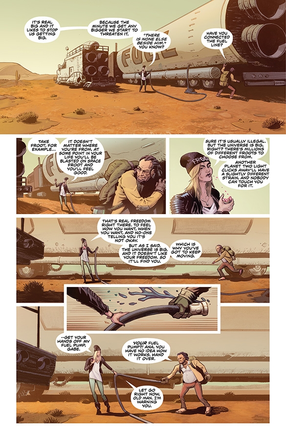 From writer RYAN O'SULLIVAN (Turncoat, The Evil Within, Warhammer 40,000) and illustrator PLAID KLAUS (Turncoat), comes the story of Ana and Gabe, the last two humans left alive in the galaxy. They're low on fuel, they're low on food, and they're low on psychedelic space froot, but they're still determined to make it to the promised land: hippy-paradise, super-planet Euphoria. This is the story of their journey, the friends and enemies they made along the way, and how the universe responded to those who dared to live freely within it.