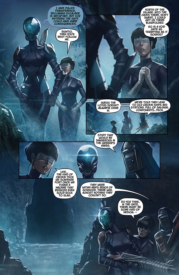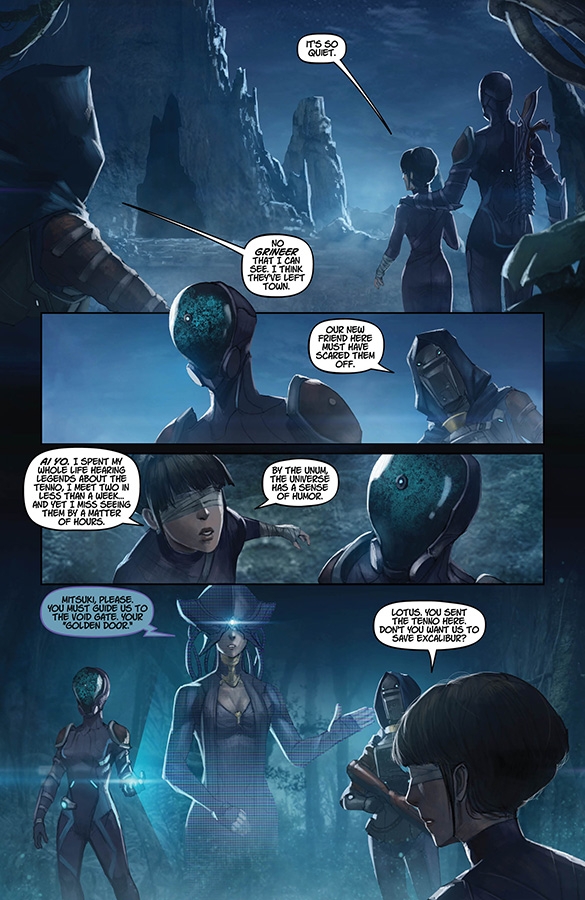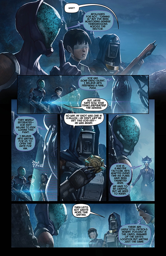 The official comic continues! As the Tenno rescue mission evolves into an investigation of an ancient Orokin mystery, the twice-defeated Captain Vor prepares a desperate but deadly assault. Plus—the return of Excalibur?