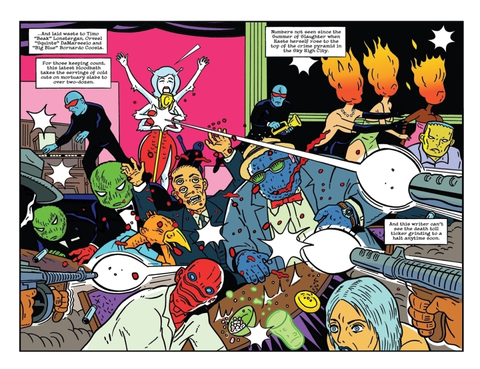 Legendary British artist SHAKY KANE (THE BULLETPROOF COFFIN) and writer JORDAN THOMAS (Frank At Home On The Farm) are your guides through the corrupt seedy streets of Stellar City in their new MINISERIES! The hard-boiled noir of LA Confidential mixes with the bright alien-filled worlds of Futurama in this crime epic. Following months of gang shootings Detective Ovra Sawce is paired with a new partner on a triple homicide. But what were a billionaire's assistant a hood-turned-cult leader and Sawce's former partner doing in that warehouse?