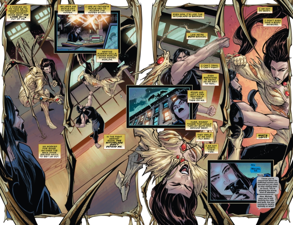 Left battered and beaten, Sara narrowly escapes from Kenneth Iron's arena and takes refuge by night in the mystical space of "The Keep" in order to stay off the billionaire's radar. By day, Sara gets back to the business of being a cop while her training with Ian Nottingham continues. Sara starts to piece together the connections between her father's murder and its ties to supernatural forces around her. One lead, the mob enforcer, twenty-year-old Jackie Estacado, has been on Sara's radar. Her brief encounter with him previously left her shaken and wondering what the true nature of this dark killer is and how he is connected to the forces of darkness and light that have shaped her life. In these pages, Sara and Jackie finally clash, and the universe will never be the same!