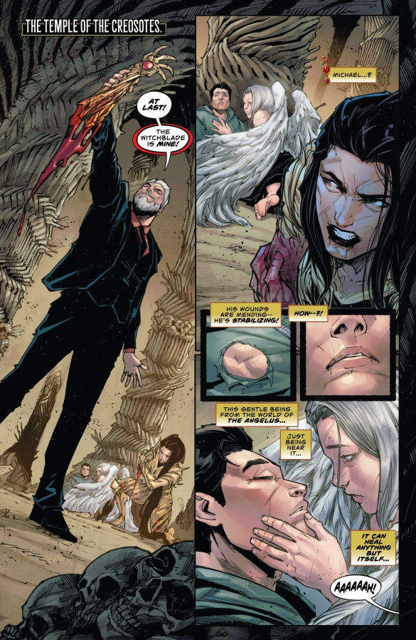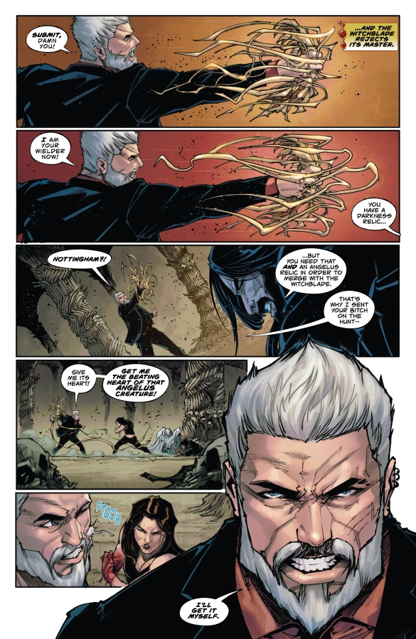 Maimed by her enemy, Kenneth Irons, Sara draws upon the ancient powers of The Darkness and the Angelus to rise, transform, and strike back, becoming something entirely new in the process. Life does not stop, as Sara must try to put the broken pieces of her life back together while also hunting down a supernatural serial killer, and more in this action-packed volume that will redefine Witchblade and set the stage for new players in the shared Top Cow Universe!