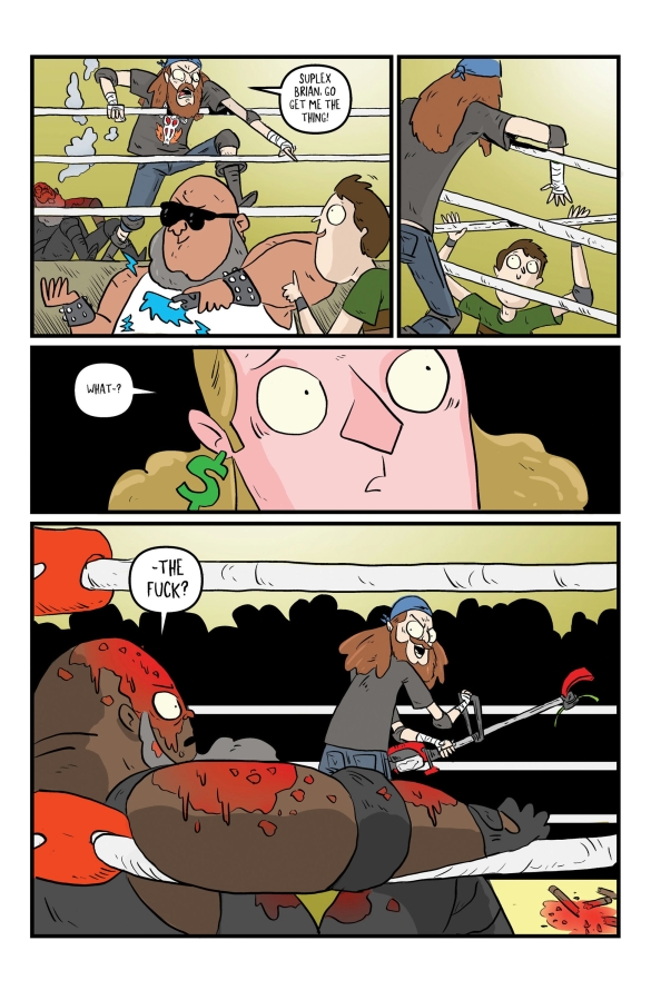 If our heroes survive the trap set for them by crooked promoter Buddy Hansen and if they can survive each other they turn their attention to the greatest heist in Wrestling History! Is there team complete? Are they prepared? Will there be a training montage? You better believe there will be! Does this issue curiously make this series an evergreen Thanksgiving season classic? Curiously it does, indeed!