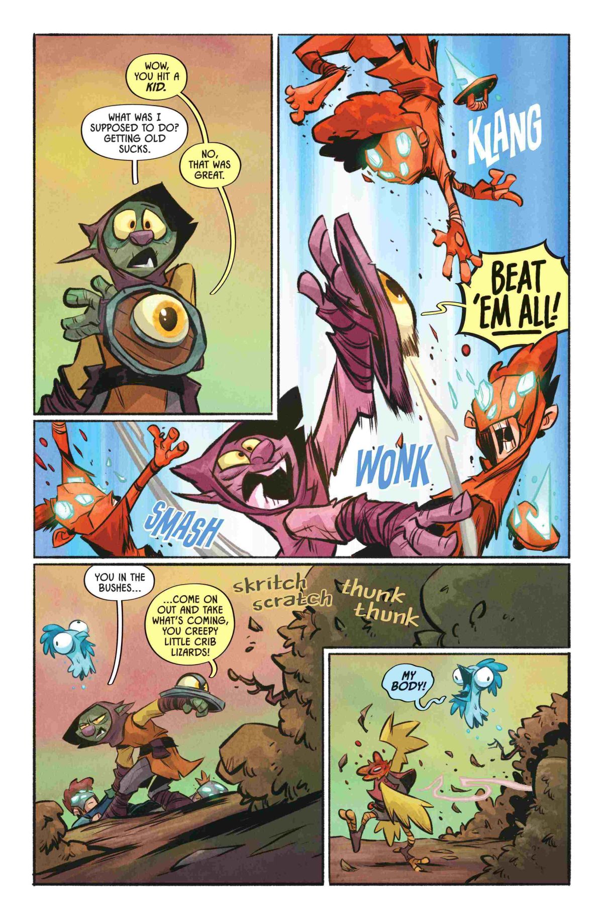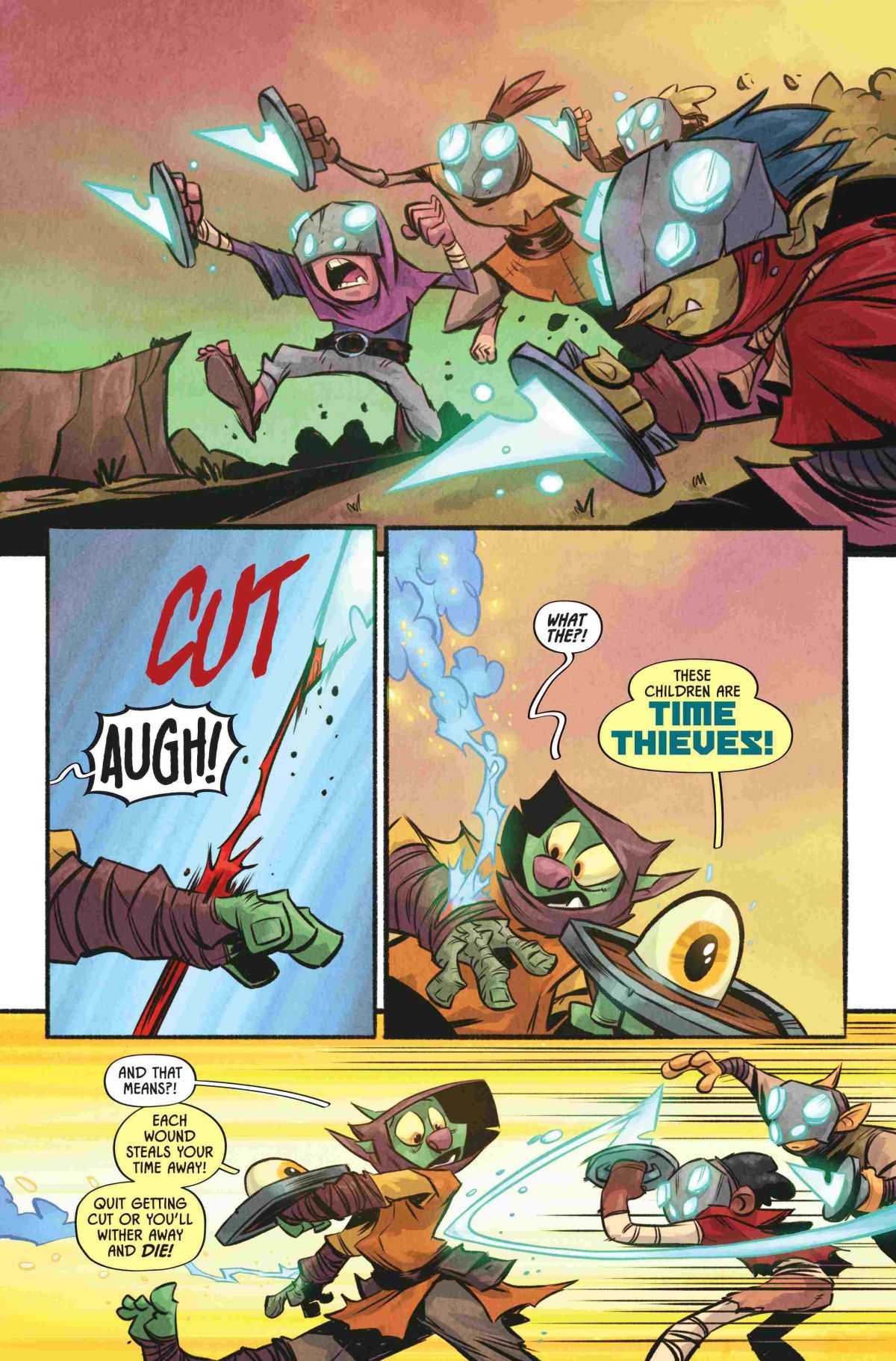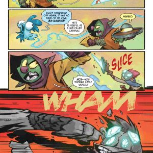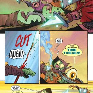 In D’orc #2, D’orc is avoiding every wizard and warrior because some DOOMSDAY prophecy says he will destroy the world. Can he change their minds? Probably not. D’Orc, his magic shield, and Ghost-chicken-with-its-head-cutoff are too busy facing a bigger challenge, KIDS!?! They’re time thieves. Oh, and there’s a Time Lord.